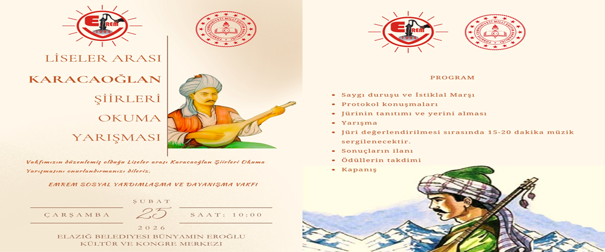 ELAZIĞ TEMSİLCİLİĞİMİZDEN, LİSELER ARASI KARACAOĞLAN ŞİİRLERİ OKUMA YARIŞMA DUYURUSU…